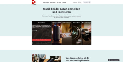 1. Auf der GEMA-Seite www.gema.de klickst du auf die mittlere Kachel „Musik nutzen und anmelden